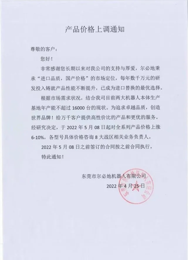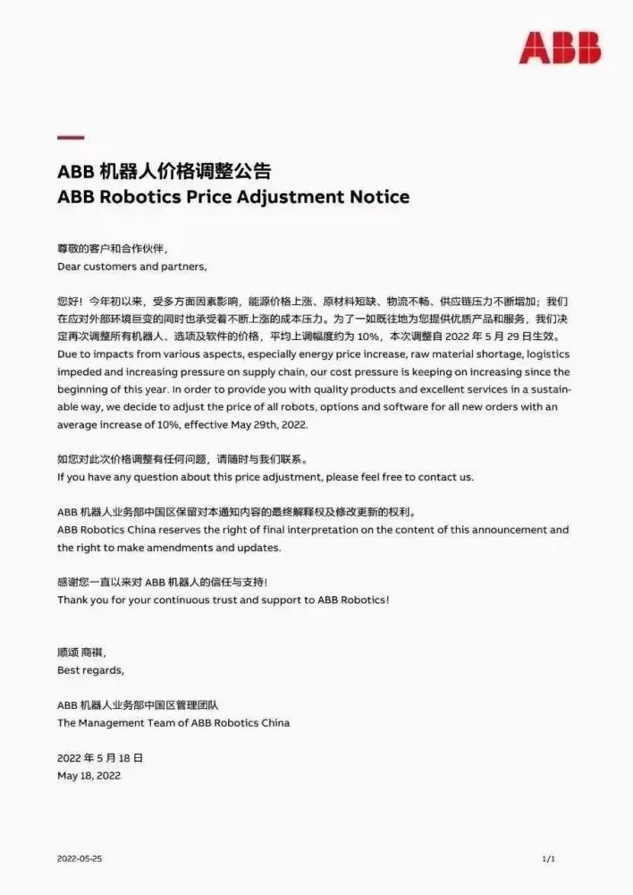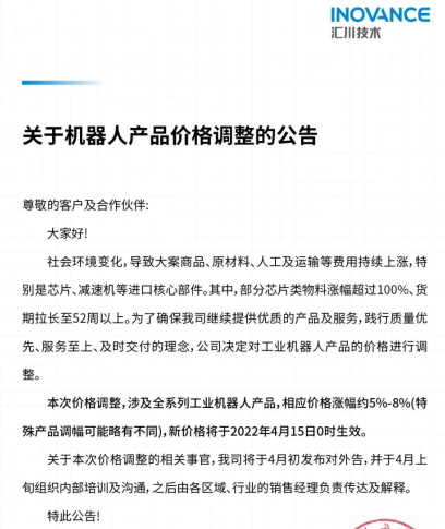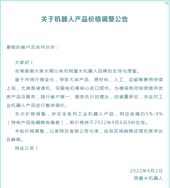 附:工業(yè)機(jī)器人廠商官宣漲價(jià)公告
