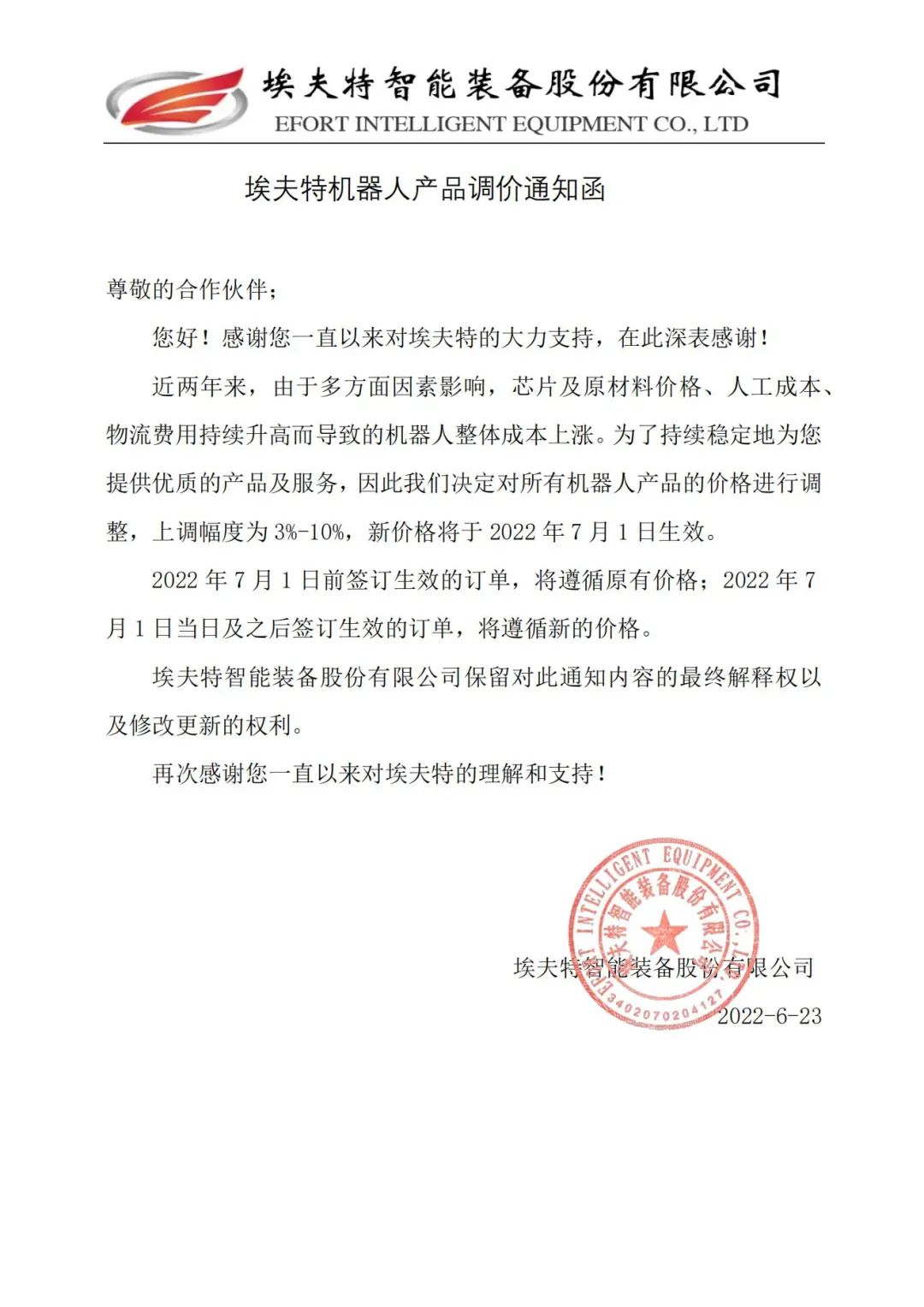 近日,國(guó)產(chǎn)工業(yè)機(jī)器人龍頭企業(yè)埃夫特宣布,自7月1日起,對(duì)公司所有機(jī)器人產(chǎn)品價(jià)格上調(diào)3%-10%。