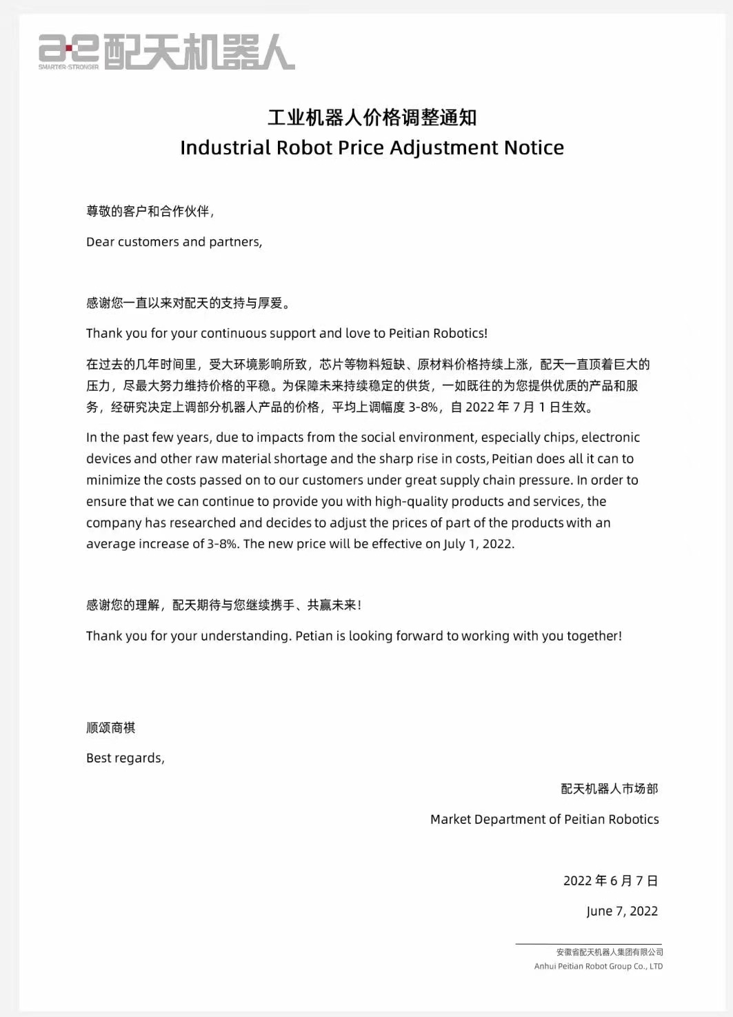 而就在本月,另一家工業(yè)機(jī)器人企業(yè)配天機(jī)器人也宣布,自2022年7月1日起,上調(diào)部分機(jī)器人產(chǎn)品的價(jià)格,平均上調(diào)幅度3-8%。