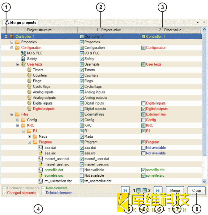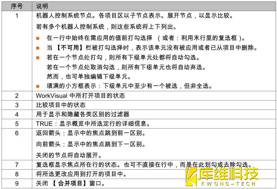 利用 【比較】功能可顯示已存項目與 KR C4 里現有項目之間的差異。 為此,必須將 KR C4 在線項目與已在 WorkVisual 保存的相同項目同時打開。